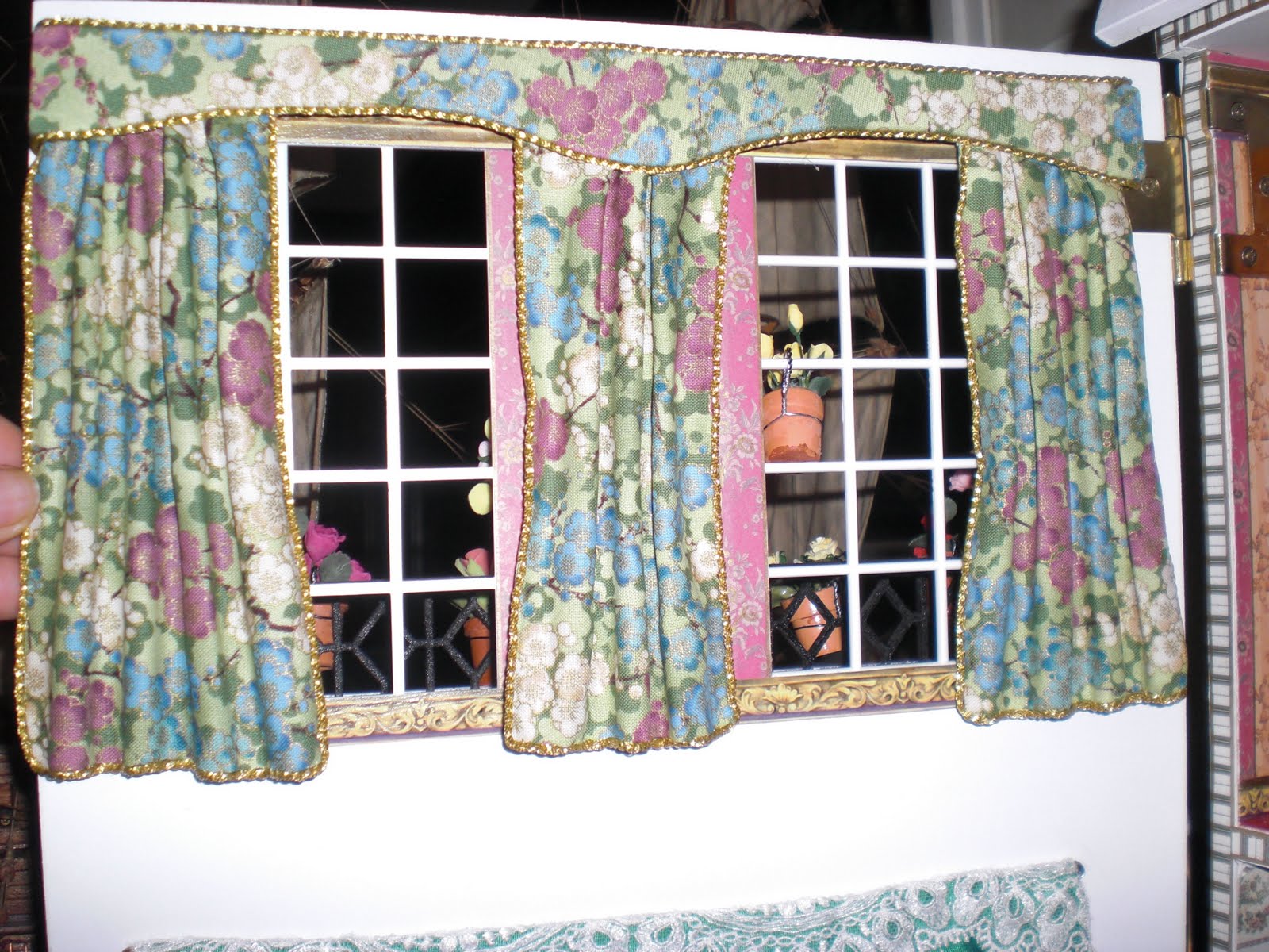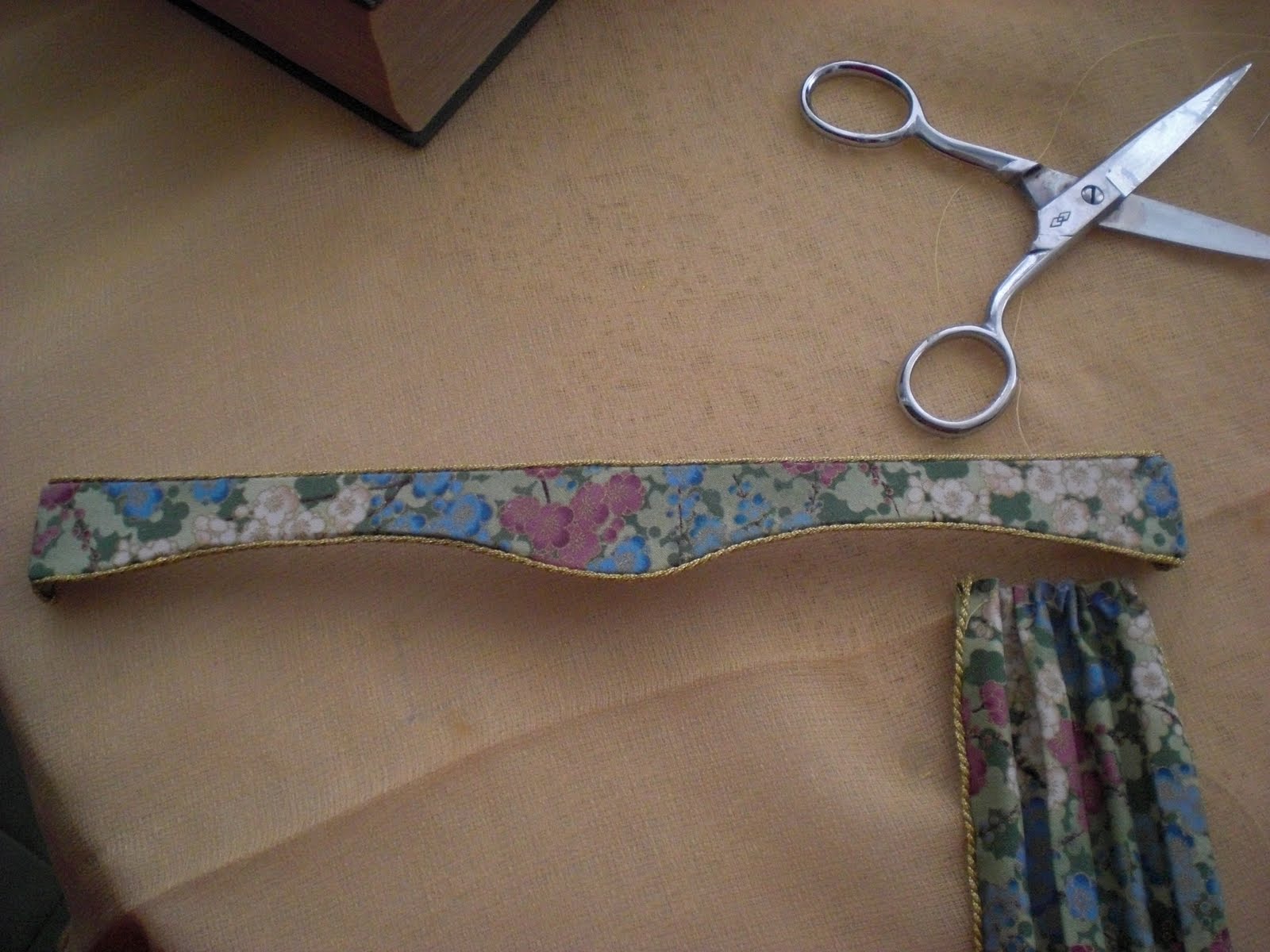 Para hacer las caidas he cogido la tela y la he bordeado con el cordoncillo dorado, luego la he rizado y para que se quede rizada y no esté "espatarrada" le he puesto unos palillos chinos como se ve en la foto y le he dado una mano de cola blanca muy diluida con agua. Así se han quedado con el rizo hecho y como si tuvieran mucha caída.